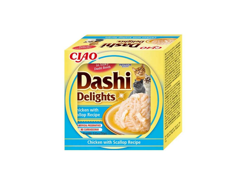 Dashi je tradiční japonský rybí vývar z tuňákových vloček, který je známý svou vyjímečnou, lahodnou chutí. Zařazení Dashi do jídelníčku vaší kočky může dodat krmení nový rozměr a učinit ho vyjímečným zážitkem. Nejde jen o chuť - dashi může poskytnout i důležité živiny včetně vitaminů a minerálů. Dashi má nízký obsah kalorií a tuku, takže je zdravým doplňkem stravy vaší kočky. Je to produkt na bázi vývaru, což znamená, že obsahuje vysoké množství vody a tím pomáhá udržet zdraví vaší kočky. Dashi se může stát chutným a výživným doplňkem stravy vaší kočky, který si díky její neodolatelné chuti určitě zamiluje. Všechny produkty Inaba jsou vždy bez obilovin, zbytečných ingrediencí a pochybných přísad a jsou vyrobené z pravého mořského tuňáka a kuřat chovaných na farmách.