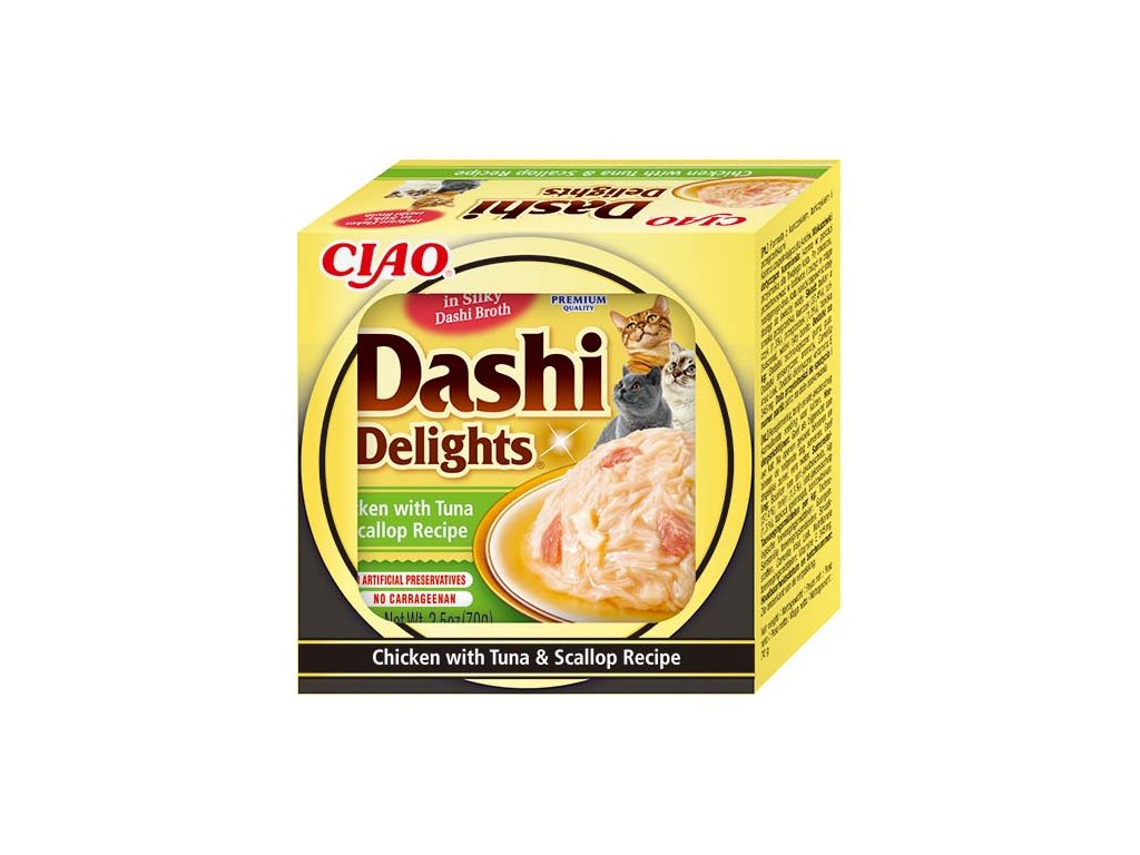 Dashi je tradiční japonský rybí vývar z tuňákových vloček, který je známý svou vyjímečnou, lahodnou chutí. Zařazení Dashi do jídelníčku vaší kočky může dodat krmení nový rozměr a učinit ho vyjímečným zážitkem. Nejde jen o chuť - dashi může poskytnout i důležité živiny včetně vitaminů a minerálů. Dashi má nízký obsah kalorií a tuku, takže je zdravým doplňkem stravy vaší kočky. Je to produkt na bázi vývaru, což znamená, že obsahuje vysoké množství vody a tím pomáhá udržet zdraví vaší kočky. Dashi se může stát chutným a výživným doplňkem stravy vaší kočky, který si díky její neodolatelné chuti určitě zamiluje. Všechny produkty Inaba jsou vždy bez obilovin, zbytečných ingrediencí a pochybných přísad a jsou vyrobené z pravého mořského tuňáka a kuřat chovaných na farmách.