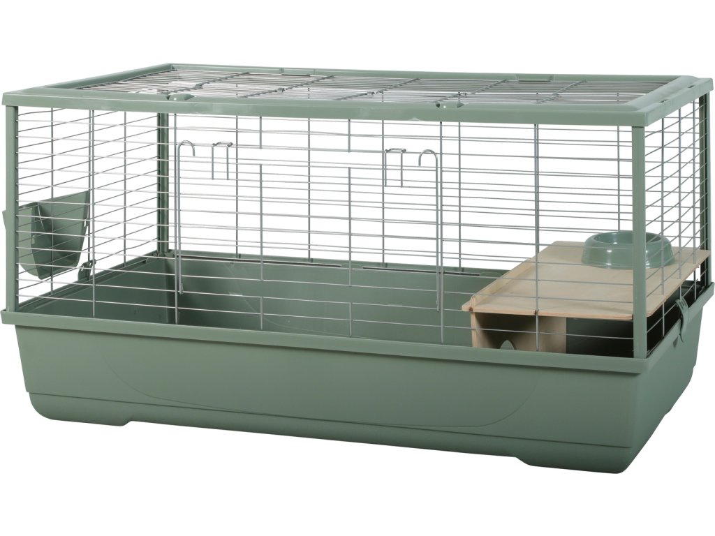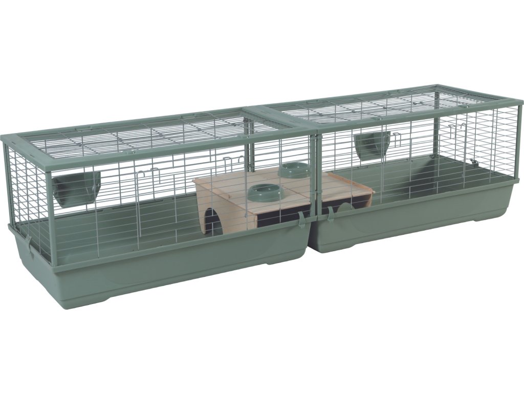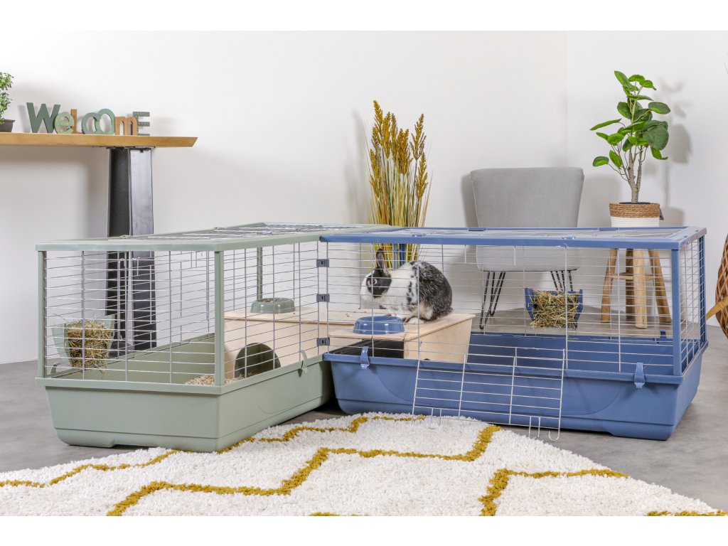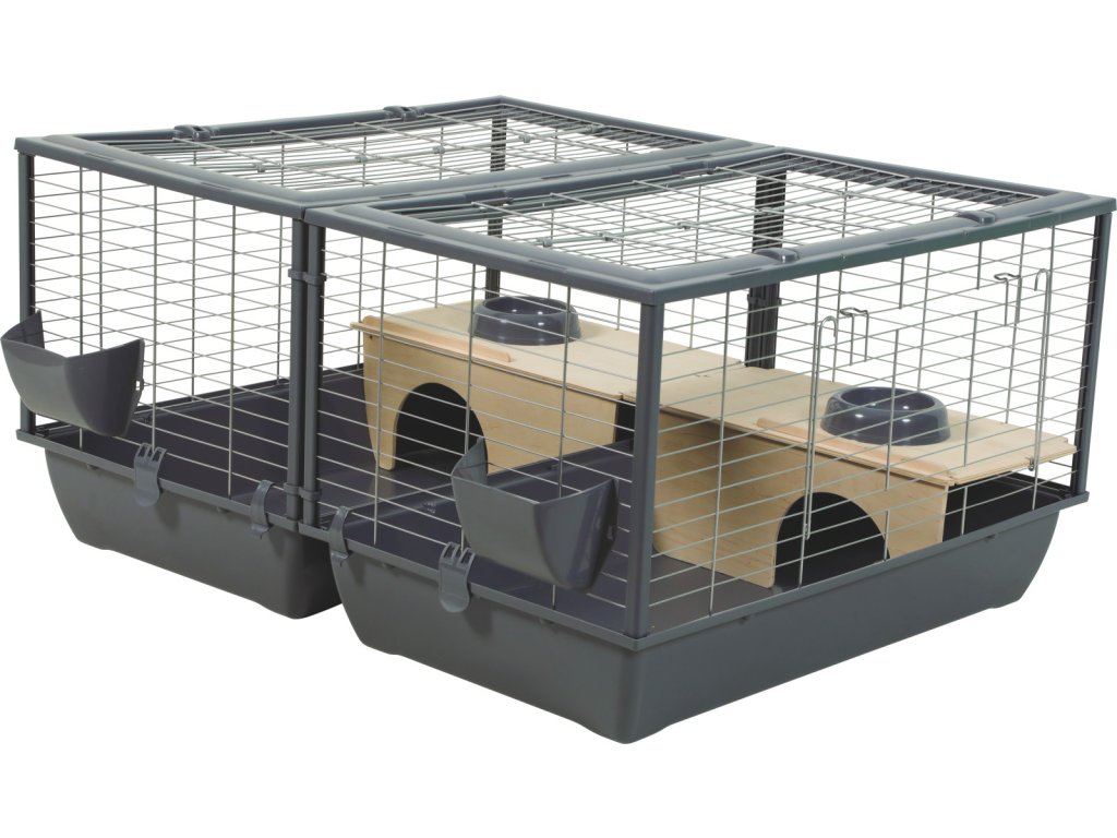 Propojitelná a modulární klec s vnitřním vybavením pro králíky a morčata.