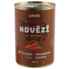 Šťavnaté kompletní krmivo v konzervě obsahuje 95 % mletého hovězího masa v pevné složce. Zbylých 5 % obsahu tvoří mrkev, přidané vitamíny a minerály a rozemletý prášek...