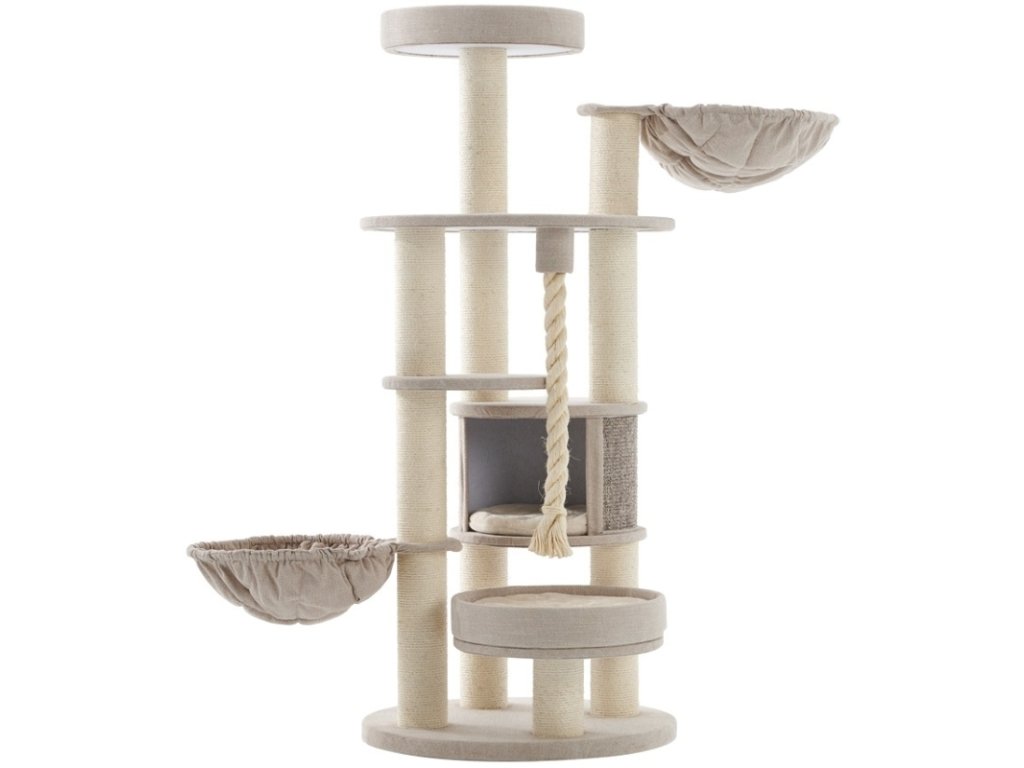 Vícepatrové stromové škrabadlo Fida pro kočky v krémové barvě a sisalovým kmenem. Plošiny a budka jsou kompletně potaženy látkou.
